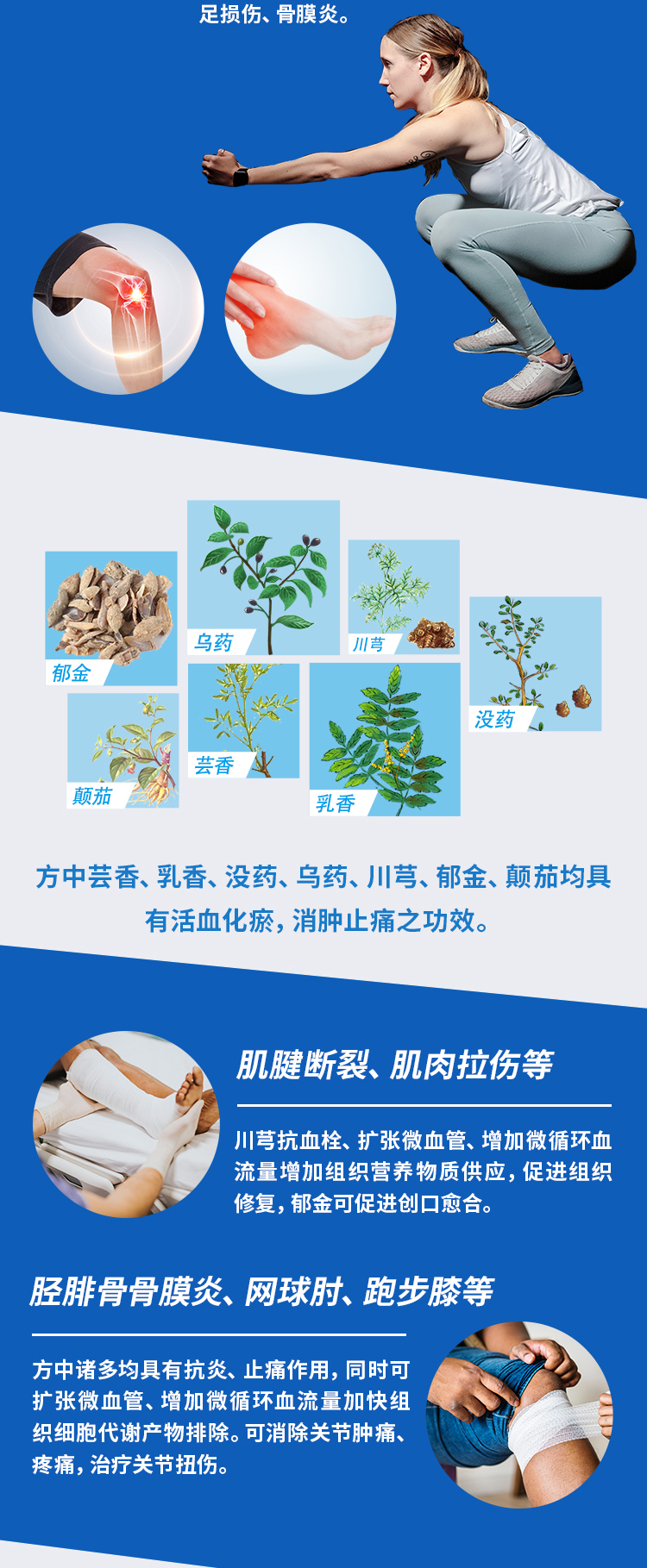 活血化瘀、和络止痛,用于运动劳损、肌肉酸痛、跌打扭伤。